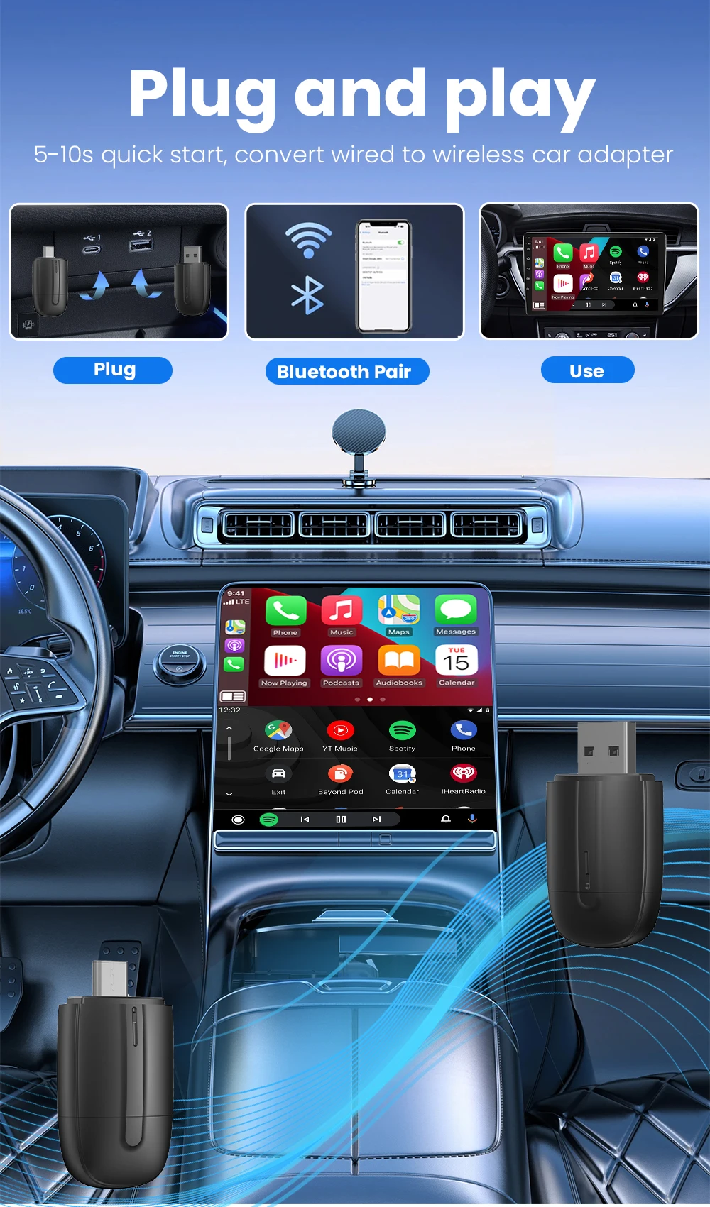 Actualiza al instante el sistema de infoentretenimiento de tu vehículo en 2026 con nuestro adaptador inalámbrico CarPlay Android Auto. Este innovador adaptador 2 en 1 ofrece una solución plug-and-play perfecta para convertir tu sistema CarPlay o Android Auto con cable en una experiencia totalmente inalámbrica. El adaptador inalámbrico CarPlay Android Auto se conecta mediante un sencillo puerto USB Tipo C y utiliza tecnología Bluetooth y Wi-Fi para vincularse automáticamente con tu smartphone al arrancar el coche. Olvídate de los cables engorrosos y disfruta de la comodidad de la conectividad manos libres instantánea.
