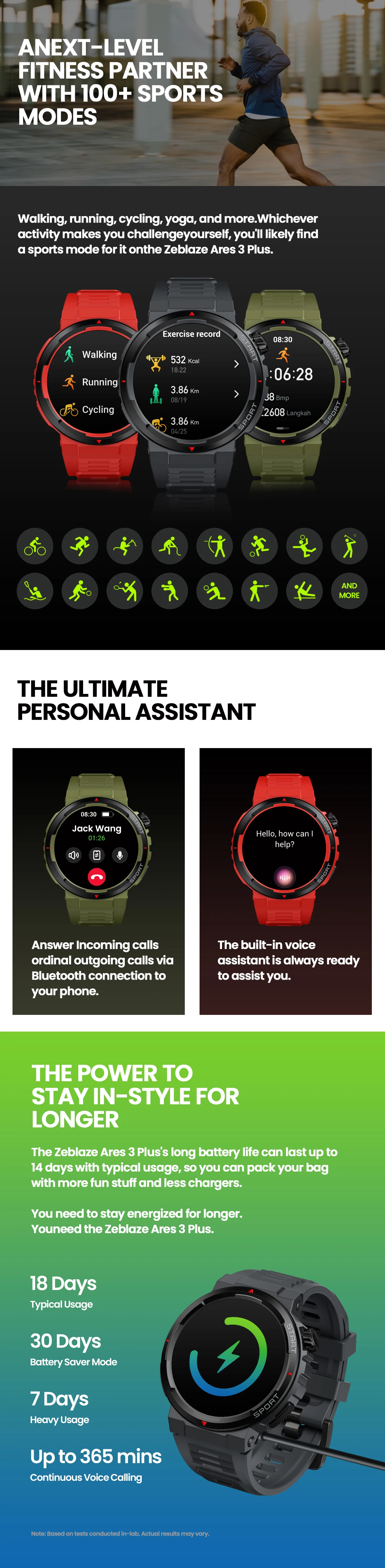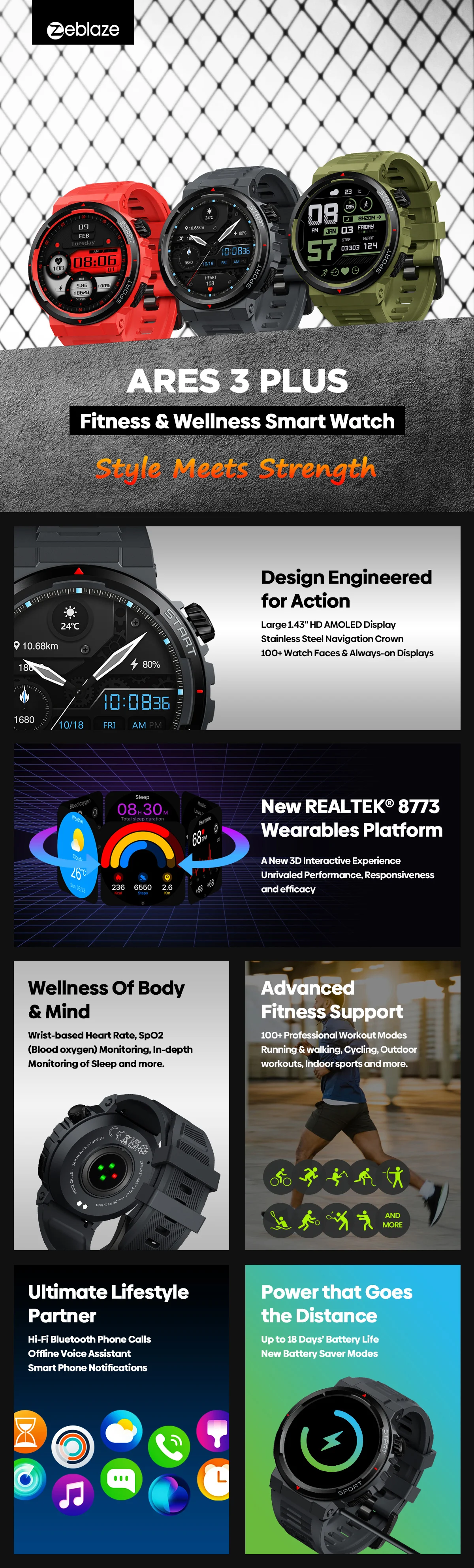 Descubre el reloj inteligente Zeblaze Ares 3 Plus, tu compañero de fitness ideal. Disfruta de llamadas Bluetooth y una impresionante pantalla AMOLED HD de 1.43" siempre activa para monitorizar tu salud en tiempo real.
