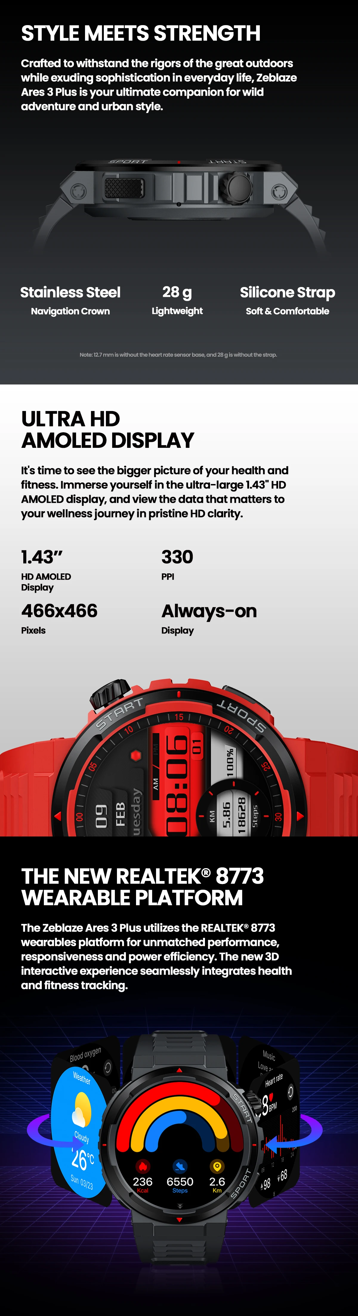 【Una nueva experiencia interactiva 3D】El Zeblaze Ares 3 Plus utiliza la plataforma de wearables REALTEK® 8773 para ofrecer un rendimiento, una capacidad de respuesta y una eficiencia energética inigualables. Esta nueva experiencia interactiva 3D integra a la perfección el seguimiento de la salud y la actividad física.