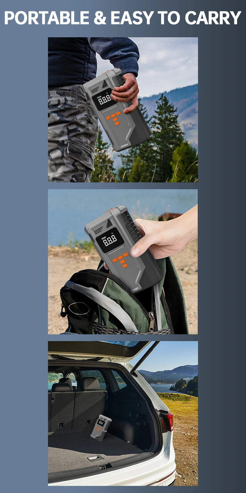Restez préparé à chaque voyage avec le démarreur de secours et gonfleur tout-en-un – compact, rechargeable et compatible avec les voitures, les SUV et les camions.