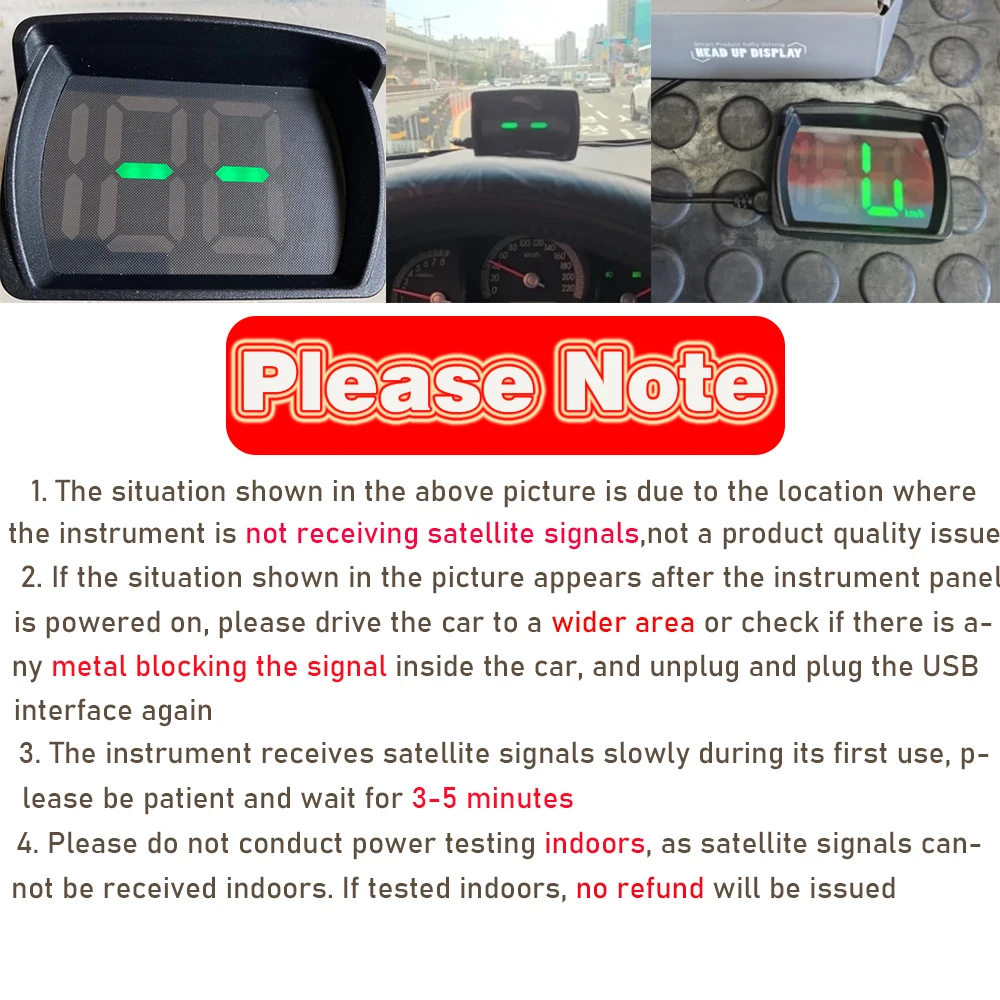3. Remarque : Cet appareil est un compteur de vitesse numérique GPS, et la vitesse est collectée à partir des satellites. Donc, si vous testez à la maison ou sur un parking, la vitesse ne peut peut-être pas être affichée correctement. Veuillez effectuer le test à l'extérieur du véhicule avec un bon signal.