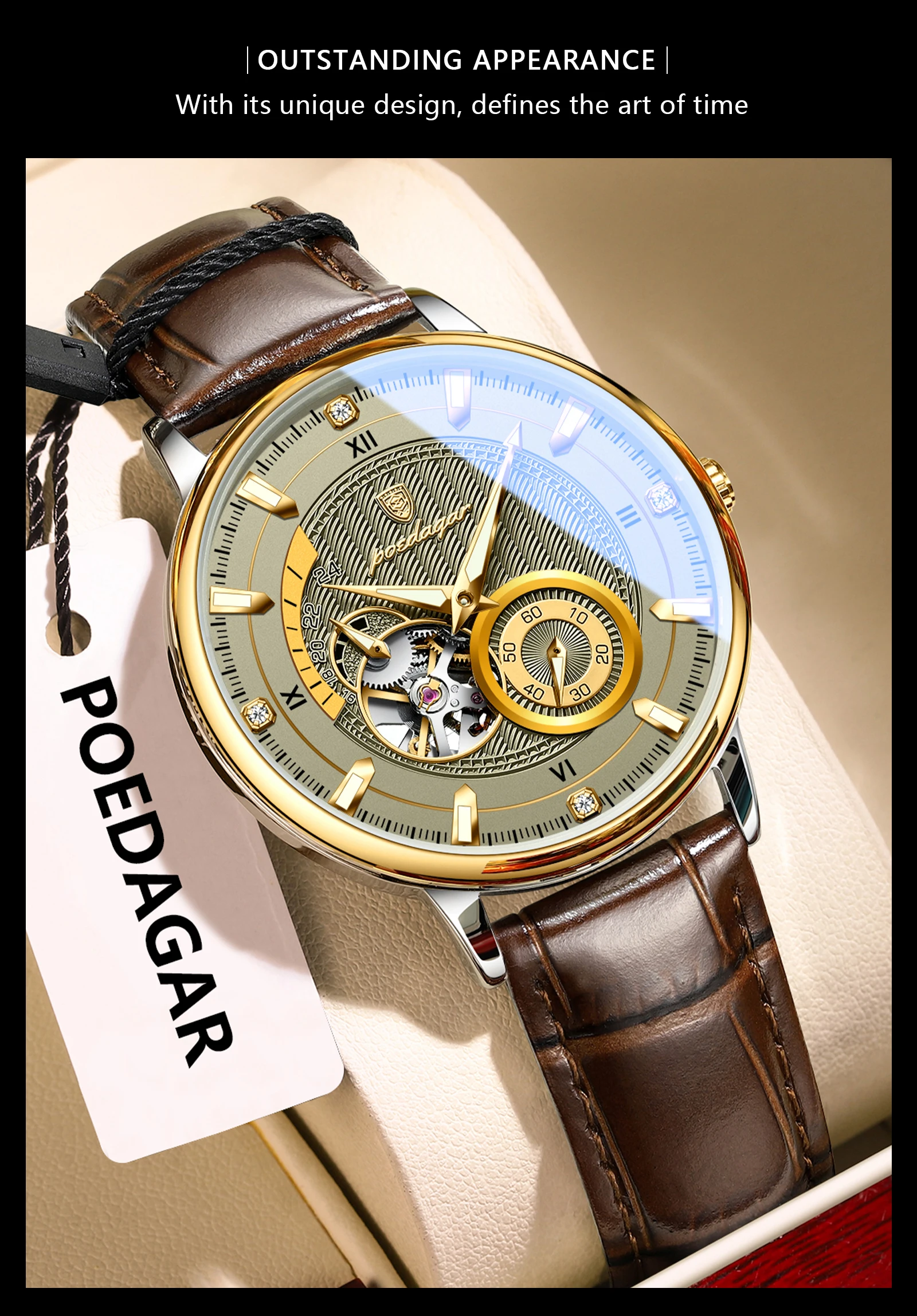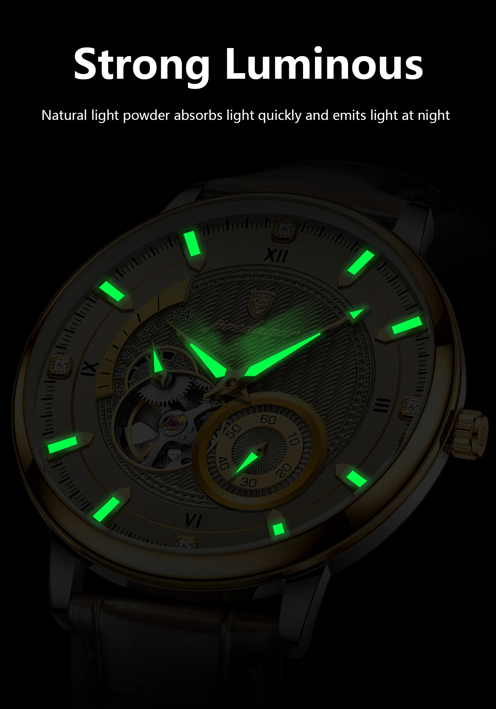 Découvrez l'élégance de notre montre tourbillon lumineuse pour hommes. Cette montre mécanique automatique étanche est dotée d'un bracelet en cuir élégant, idéal pour toutes les occasions. Achetez maintenant !