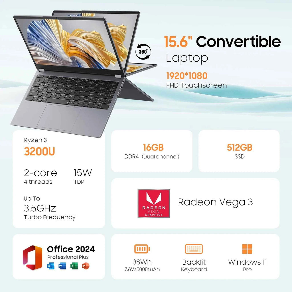 2 in 1 Laptop 15.6" Touchscreen - 16GB RAM, 512GB Storage, AMD Ryzen R3 3200U, Radeon Vega 3, FHD Display, Backlit Keyboard