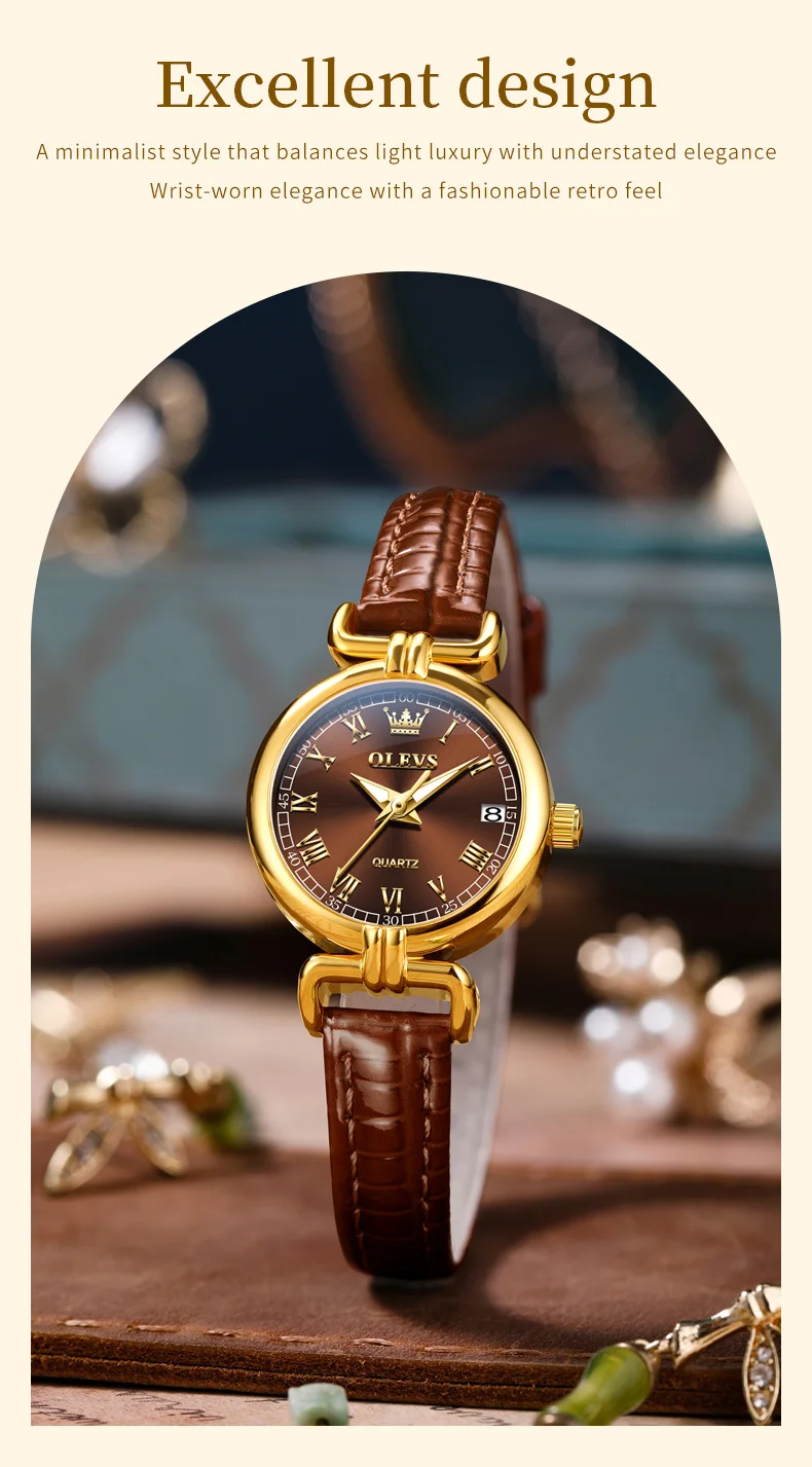 Discover elegance with the OLEVS Womens Elegant Quartz Watch featuring a waterproof leather strap and a luminous date feature, it's the perfect gift for ladies and girls.
